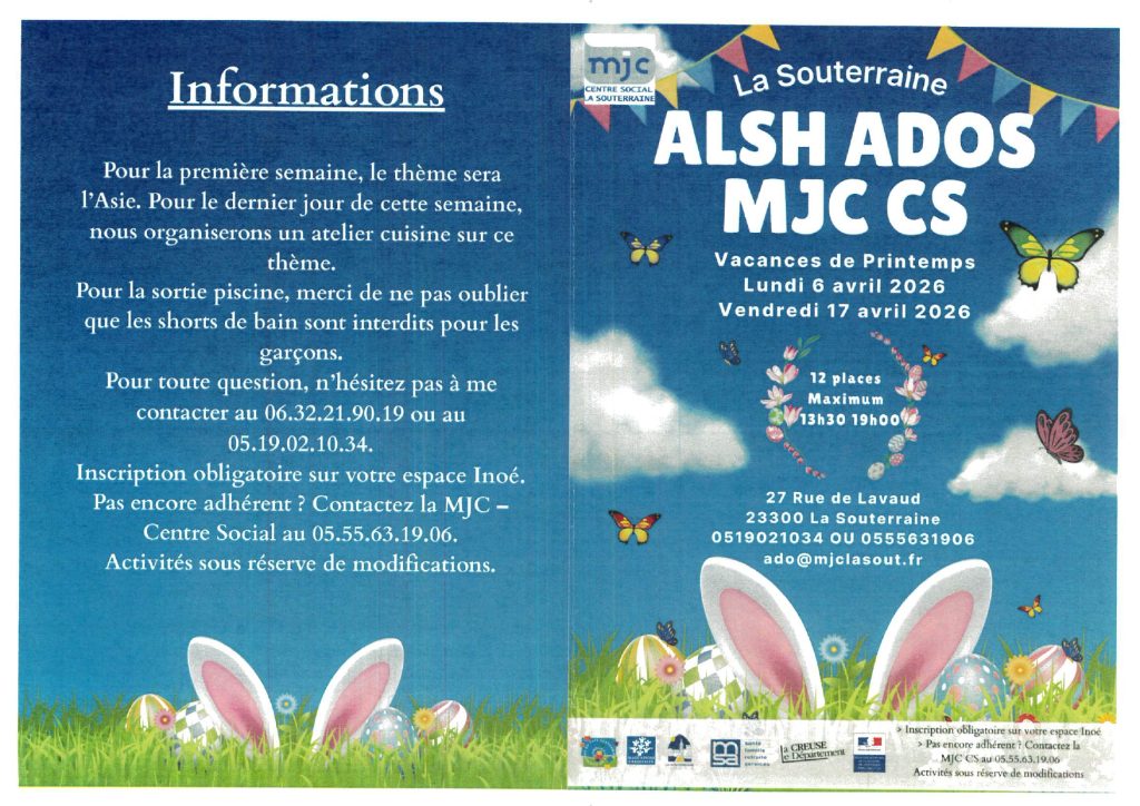 Infos et réservations : 05 19 02 10 34 ou ado@mjclasout.fr